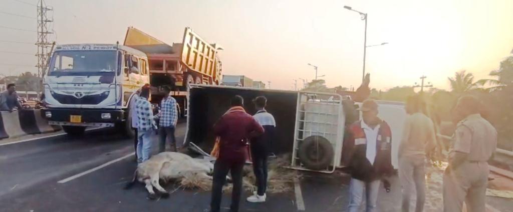 ଭଦ୍ରକ, ୭ା୨ (ଓଡ଼ିଆ ପୁଅ / ସ୍ନିଗ୍ଧା ରାୟ) -ଭଦ୍ରକ ଗ୍ରାମାଂଚଳ ଥାନା ଅଧିନସ୍ଥ ୧୬ ନମ୍ବର ଜାତୀୟ ରାଜପଥ ଆରଡ଼ି ଛକ ବ୍ରିଜ ଉପରେ ବେଆଇନ ଚାଲାଣ ହେଉଥିବା ଏକ ଗୋରୁ ବୋଝେଇ ପିକପ ଭେନ ଓଲଟିବା ଫଳରେ ଗୋଟିଏ ଗୋରୁ ମୃତ୍ୟୁ ବରଣ କରିଛି।ଅନ୍ୟ ଦୁଇଟି ଗୋରୁକୁ ଉଦ୍ଧାର କରିଛନ୍ତି ଗୋ ରକ୍ଷକ। ଆହତ ଡ୍ରାଇଭରକୁ ଭଦ୍ରକ ମୁଖ୍ୟ ଚିକିତ୍ସାଳୟରେ ଭର୍ତି କରାଯାଇଥିବାବେଳେ ଅନ୍ୟ ଜଣଙ୍କୁ ଥାନାରେ ଅଟକ ରଖି ପୋଲିସ ତଦନ୍ତ ଆରମ୍ଭ କରିଛି।ଘଟଣା ସ୍ଥଳ ଜାତୀୟ ରାଜପଥର ଗୋଟିଏ ପାର୍ଶ୍ୱ ରେ କିଛି ସମୟ ପାଇଁ ଗାଡି ଚଳାଚଳ ବନ୍ଦ ରହିଥିଲା।ସେଠାରେ ପୋଲିସ ପହଂଚି ତଦନ୍ତ ଆରମ୍ଭ କରିବା ସହିତ ଦୁର୍ଘଟଣା ଗ୍ରସ୍ତ ଗାଡି କୁ ସାଇଟ କରିବା ପରେ ଗାଡି ଚଳାଚଳ ସ୍ୱାଭାବିକ ହୋଇଥିଲା।
