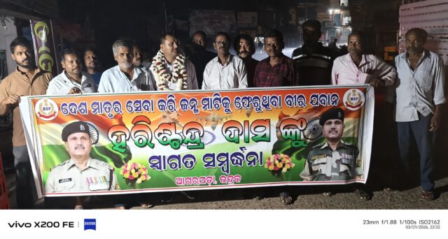 ଭଦ୍ରକ, ୨ା୩ (ଓଡ଼ିଆ ପୁଅ / ସ୍ନିଗ୍ଧା ରାୟ) – ଦେଶ ମାତୃକାର ସେବା କରି ନିଜ ଜନ୍ମ ମାଟିକୁ ଫେରିଥିବା ସୀମା ସୁରକ୍ଷା ବାହିନୀର ଇନ୍ସପେକ୍ଟର ହରିଶ୍ଚନ୍ଦ୍ର ଦାସଙ୍କୁ ଭଦ୍ରକ ଜିଲ୍ଲା ଐତିହାସିକ ଆଗରପଡା ମାଟିରେ ଭବ୍ୟ ସ୍ୱାଗତ ସମ୍ବର୍ଦ୍ଧନା ଦିଆଯାଇଛି । ଦୀର୍ଘ ୪୧ ବର୍ଷର ଚାକିରୀ କାଳ ମଧ୍ୟରେ ଜମ୍ମୁ କାଶ୍ମୀର, ରାଜସ୍ଥାନ, କଲିକତା, ଆସାମ, ଦିଲ୍ଲୀ, ଗୁଜୁରାତ ପରେ ଓଡିଶାର କୋରାପୁଟରୁ ଅବସର ଗ୍ରହଣ କରିଥିଲେ । ରବିବାର ରାତ୍ରରେ ଜନ୍ମ ମାଟିରେ ପହଚିଂବା ପରେ ଆଗରପଡା କଲେଜ ଛକ ଠାରେ ତାଙ୍କୁ ବିଭିନ୍ନ ସଂଗଠନ ପକ୍ଷରୁ ଭବ୍ୟ ସ୍ୱାଗତ ସମ୍ବର୍ଦ୍ଧନା ଦିଆଯାଇଥିଲା । କାର୍ଯ୍ୟକ୍ରମରେ ବରିଷ୍ଠ ସାମ୍ବାଦିକ ହେମନ୍ତ ସିଂହ, ବିଶ୍ୱ ହିନ୍ଦୁ ପରିଷଦର ପ୍ରତାପ ସାହୁ, ଯୁବ ସମାଜସେବୀ ଶୁଭ୍ରଜିତ୍ ପଣ୍ଡା, ବିପିନ ବିହାରୀ ଖଟୁଆ, ସୁରେଶ ପରିଡା, ପ୍ରଫୁଲ୍ଲ ମହାନ୍ତି, ବ୍ୟବସାୟୀ କାହ୍ନୁ ଚରଣ ସାହୁ, ସଞ୍ଜୟ ସିଂହ ପ୍ରମୁଖ ଉପସ୍ଥିତ ଥିଲେ । ପରେ ତାଙ୍କୁ ଏକ ସୁସଜ୍ଜିତ ଗାଡିରେ ମୋଟର ସାଇକେଲ ଶୋଭାଯାତ୍ରା ସହ ଦେଶାତ୍ମବୋଧ ସଙ୍ଗୀତ ଯୋଗେ ରାଉତରାପୁରସ୍ଥିତ ବାସ ଭବନକୁ ପାଚ୍ଛୋଟି ନିଆଯାଇଥିଲା । ଇନ୍ସପେକ୍ଟର ହରିଶ୍ଚନ୍ଦ୍ର ନିଜ ଚାକିରୀ କାଳ ମଧ୍ୟରେ ଅନେକ ଦୁଃସାହାସିକ କାର୍ଯ୍ୟ କରି ପ୍ରଶଂସାର ପାତ୍ର ହୋଇଥିବା ବେଳେ ଆଗକୁ ବିଭିନ୍ନ ସଙ୍ଗଠନ ସହ ଜଡିତ ରହି ସେବା କାର୍ଯ୍ୟ କରିବେ ବୋଲି କହିଛନ୍ତି ।