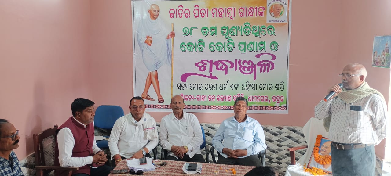 ଭଦ୍ରକ, ୩୦ା୧ (ଓଡ଼ିଆ ପୁଅ / ସ୍ନିଗ୍ଧା ରାୟ) – ଜାତିର ପିତା ମହାତ୍ମା ଗାନ୍ଧିଙ୍କ ୭୮ତମ ପୂର୍ଣ୍ୟତିଥି ଉପଲକ୍ଷେ ଧାମନଗର ମହତାବ ସେବା ସଦନ ପରିସରରେ ଗାନ୍ଧୀ ଜନକ କଲ୍ୟାଣ ସମିତି ପକ୍ଷରୁ ଏକ ଶ୍ରଦ୍ଧାଞ୍ଜଳି ସଭା ଅନୁଷ୍ଠିତ ହୋଇଯାଇଛି। ସମିତିର ଅବାହକ ସଞ୍ଜୟ ମିଶ୍ରଙ୍କ ଆହ୍ୱାନରେ ଆୟୋଜିତ ଏହି ସଭାରେ ବଶିଷ୍ଠ ସାମ୍ବାଦିକ ବାସୁଦେବ ତ୍ରିପାଠୀ ସଭାପତିତ୍ୱ ନୂତନ କରି ଗଢ଼ିଉଠିଥିବା ଏହି ସାମାଜିକ ଅନୁଷ୍ଠାନର ମୂଖ୍ୟ ଉଦ୍ଦେଶ୍ୟ ହେଲା ମହାତ୍ମା ଗାନ୍ଧିଙ୍କ ଅହିଂସା, ସତ୍ୟ ଓ ସରଳତାର ବିଚାରଧାରାକୁ ସମାଜ ମଧ୍ୟରେ ପ୍ରଚାର ଓ ପ୍ରସାର କରିବା। ଏହି ସଭାରେ ରସାନନ୍ଦ ମହାପାତ୍ର, ନାରାୟଣ ଚନ୍ଦ୍ର ନାୟକ, ମାନସ ରଞ୍ଜନ ମହାପାତ୍ର, ପ୍ରଭାତ ପଣ୍ଡା, ଅଭିରାମ ମହାନ୍ତି, ପ୍ରମୋଦ ସ୍ୱାଇଁ, ଲକ୍ଷ୍ମୀନାରାୟଣ ମିଶ୍ର, ଅରବିନ୍ଦ ନାୟକ, ସେକ ତାରିଖ ଆନୁଆର ସମେତ ଅନେକ ବୁଦ୍ଧିଜୀବୀ ଓ ସମାଜସେବୀ ଉପସ୍ଥିତ ଥିଲେ। ଏହି ଅବସରରେ ଧାମନଗରରେ ଗାନ୍ଧୀଜୀଙ୍କ ଏକ ମୂର୍ତି ନିର୍ମାଣ ପାଇଁ ତହସିଲଦାରଙ୍କ ଉଦ୍ଦେଶ୍ୟରେ ରାଜ୍ୟପାଳଙ୍କୁ ଦାବିପତ୍ର ପ୍ରଦାନ କରାଯାଇଥିଲା।